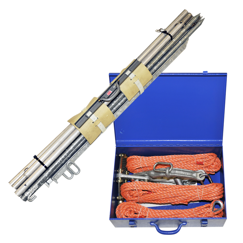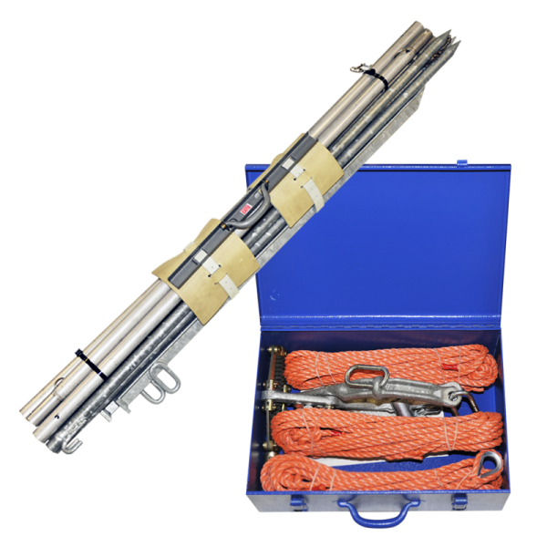 Abspannen erfolgt durch Erdanker oder ersatzweise durch starre Befestigungspunkte an Gebäude, Fahrzeuge etc.