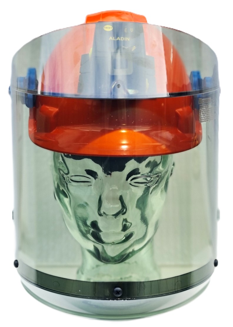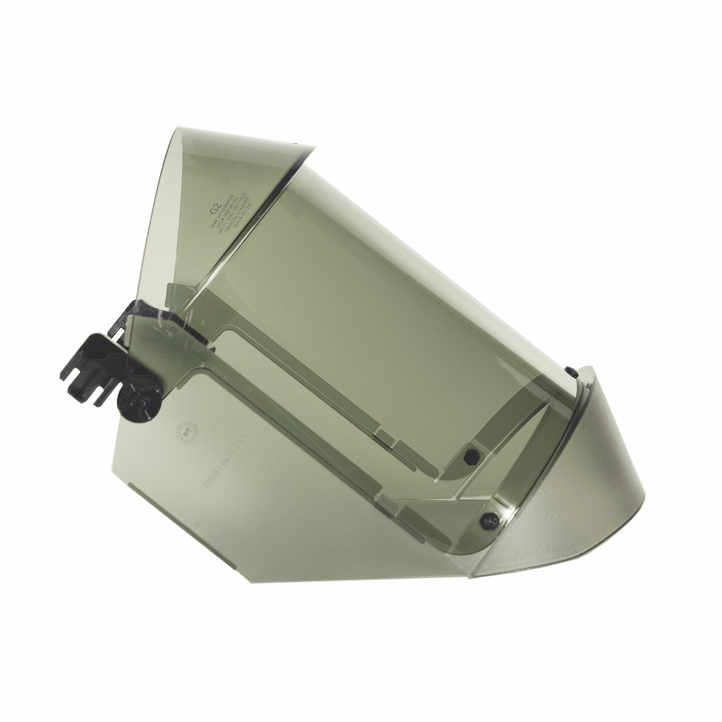 Schutzscheibe mit energieabsorbierenden Nanopartikel homogen im Material verteilt, hellgrün mit Antibschlagbeschichtung, mit transparentem Kinnschutz
